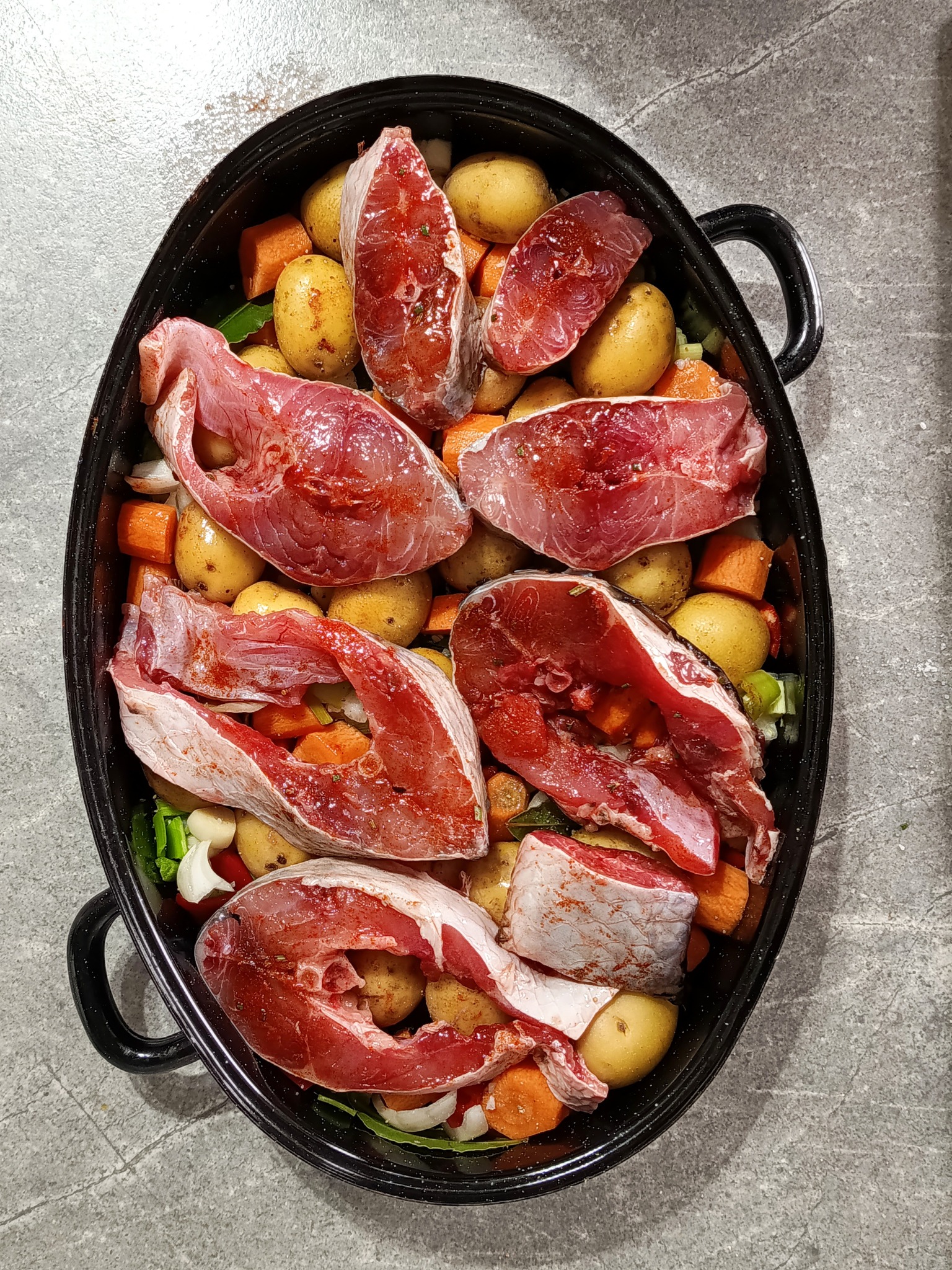 На подмачкана тава рамномерно ги распоредуваме празот, пиперките, лукот, ловоровиот лист, морковите и младите компири. Посолуваме со морска сол и бибер. Котлетите од крап ги зачинувачуваме со сол, црвен пипер и рузмарин, па ги редиме врз подготвениот зеленчук. Се полева со белото вино и доматниот сос.